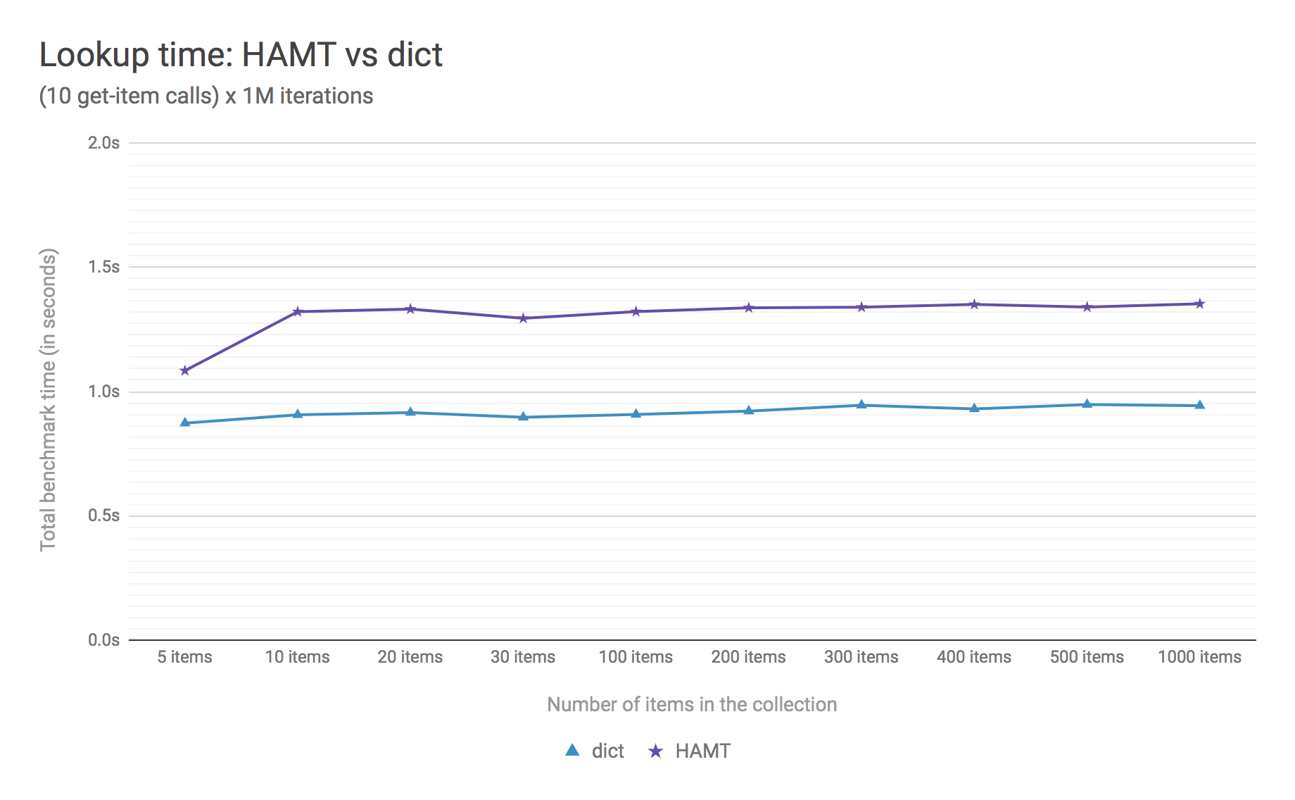 Figure 2 compares the lookup costs of dict versus a HAMT-based immutable mapping. HAMT lookup time is 30-40% slower than Python dict lookups on average, which is a very good result, considering that the latter is very well optimized.